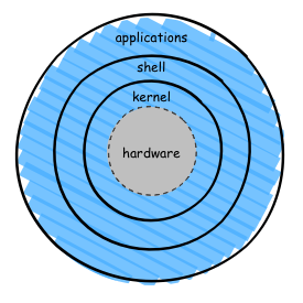 The figure on the left illustrates a simplified view of the Linux architecture. From inside out, the core of the system is called the kernel. It interacts with hardware devices, and provides upper layer components with low-level functions that hide complexity of, for example, arranging concurrent accesses to hardware. The shell is an interface to the kernel. It takes commands from user (or application) and executes kernel's functions accordingly. Applications are generally refer to system utilities providing advanced functionalities of the operating system, such as the tool cp for copying files.