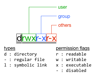 The first character presents the type of the file. In most of cases, you will see the character of d, -, or l corresponding to directory, regular or link file respectively. The file-type character is followed by 9 additional characters organised in three sets, each consists of three characters representing the read (r), write (w) and execute (x) permissions of the file. If certain permission is disabled, a - is shown instead. The three sets, from left to right, indicate permissions for the user, the group (i.e. all users in the group), and others (i.e. all other users in the system). The user and group considered here are the user and group ownership (i.e. the third and fourth columns of the table above).